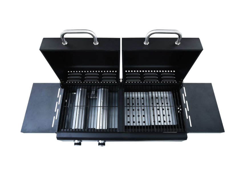 Der Kombigrill verfügt über einen Holzkohle-Bratbereich und einen Gaskochbereich mit 2 Brennern. Er ist mit 2 Hochleistungshauben ausgestattet, jede mit einem eingebauten Thermometer, das die Gartemperatur anzeigt. Zwei klappbare Ablagen bieten zusätzlichen Platz zum Zubereiten von Saucen oder Beilagen. Der Kombigrill ist aus strapazierfähigen Materialien gefertigt und daher sehr langlebig.