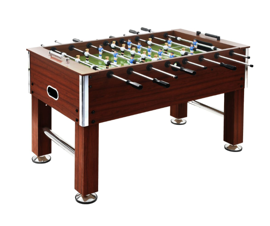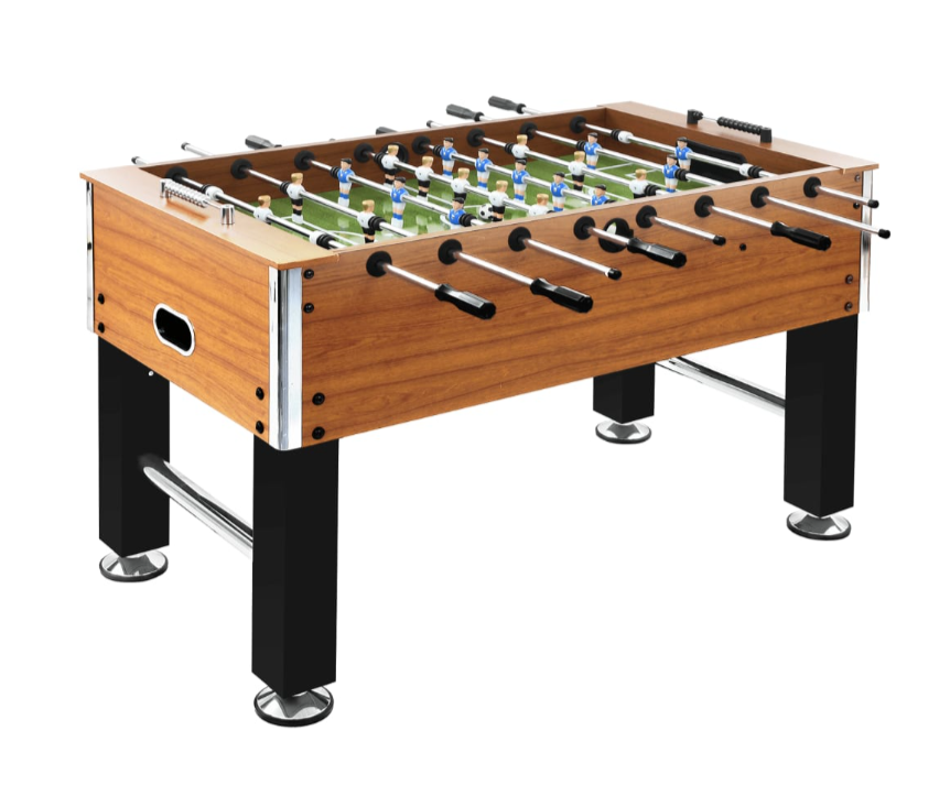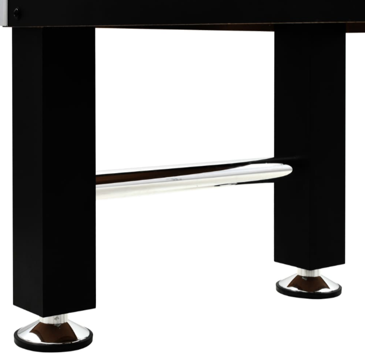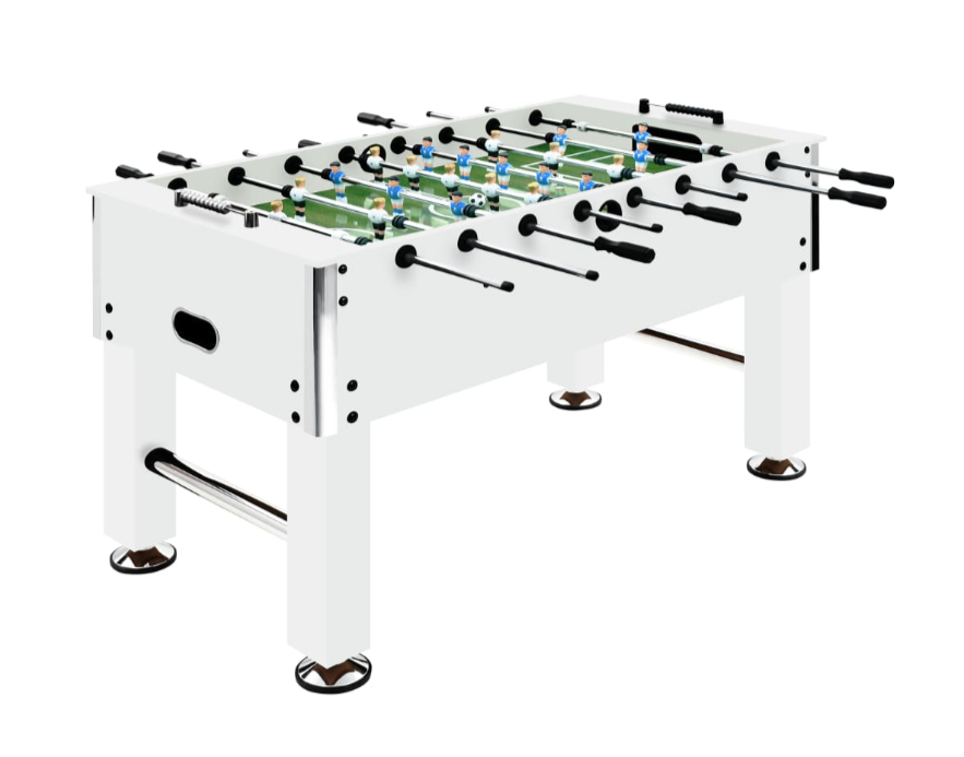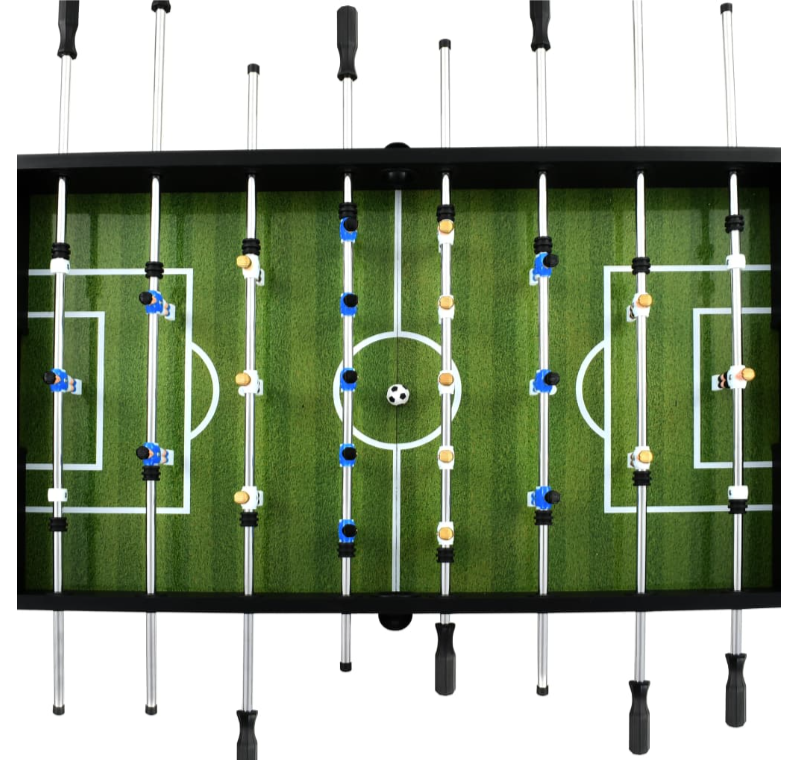 Der Tisch ist aus MDF gefertigt und verfügt über stabile Beine. Der Kicker sorgt für unvergesslichen Spaß und bietet ein hervorragendes Preis-Leistungs-Verhältnis. Die Spielflächengröße entspricht dem offiziellen Turnier-Standard und bietet ein realistisches Spielerlebnis. Der Kickertisch ist mit leicht-verschiebbaren Spielerstangen und rutschfesten Griffe für einfaches und komfortables Spielen ausgestattet. Die Beine sind für mehr Flexibilität höhenverstellbar. Ein komplettes Tischfußballspiel mit 2 Toren, 2 Fußbällen, 2 Spielstand-Anzeigetafeln, 8 Spielerstangen und 22 Spielern.